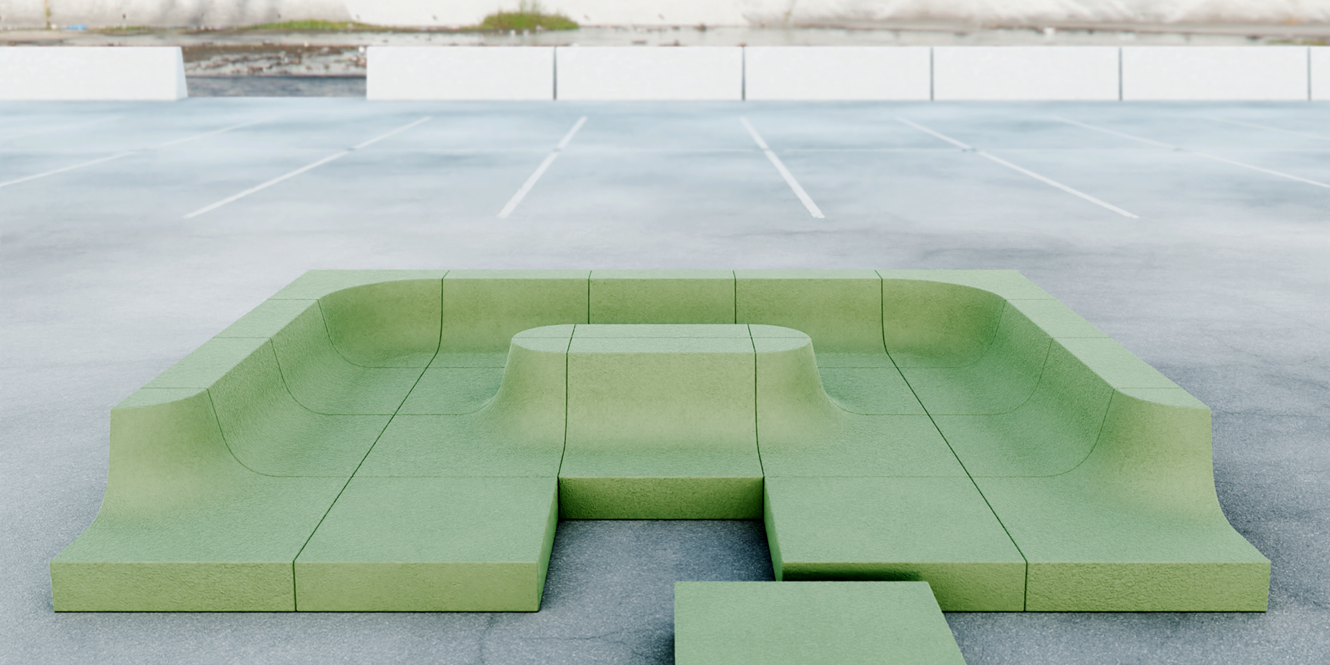 The geometry of the sofa is a reference to concrete skate parks. Hips, Ramps, Pads, and Bowls come together to create a landscape for leisure.